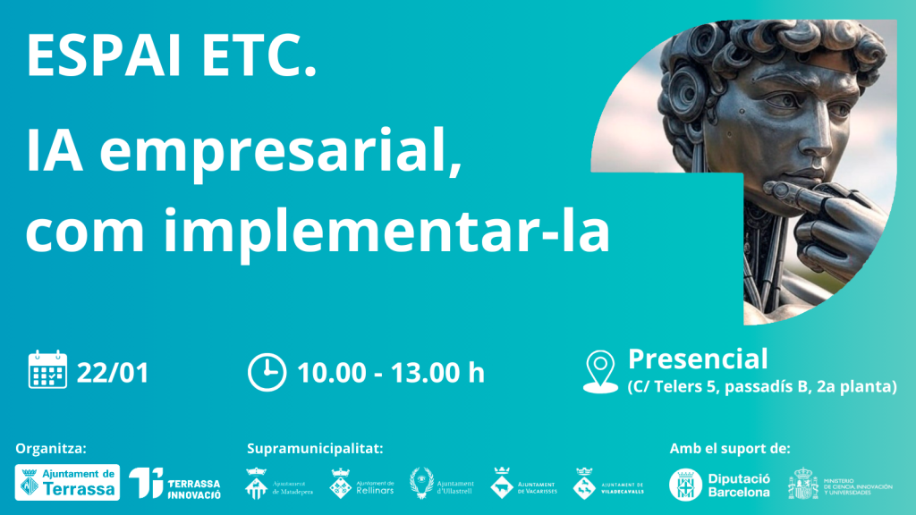 22/01/2025 10.00 – 13.00 h PRESENCIAL c/ Telers 5, 2a planta, passadís B https://maps.app.goo.gl/Ji8LMGb1igr7sCep6 Formadora: Esther Acedo, Digital Business Strategist. OBJECTIUS: – Aprendre l’aplicabilitat de la IA en els processos empresarials. – Estalviar temps i recursos en tasques repetitives: automatització de funcions. – Augmentar l’eficiència en els processos interdepartamentals. – Incrementar la productivitat dels treballadors o […]