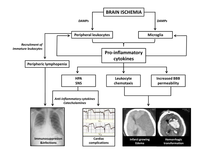 Des de l’inici del ictus es posen en marxa una sèrie de fenòmens inflamatoris que, en circumstàncies normals, permeten l’entrada de cèl·lules de defensa o leucòcits a l’àrea cerebral afectada, per eliminar les substàncies derivades de la mort cel·lular i afavorir el restabliment de la normalitat a les zones properes. Per a això és necessari un augment de la permeabilitat de la barrera hematoencefàlica, que regula el pas de substàncies entre el cervell i el torrent sanguini. No obstant això, aquesta reacció inflamatòria també té efectes deleteris, que són especialment importants quan l’ictus és més greu. L’alteració de la barrera hematoencefàlica pot tenir complicacions a nivell local, com l’infart maligne o les hemorràgies a la zona de l’infart, que suposen un perill per a la vida del pacient. A nivell perifèric, l’excessiva resposta inflamatòria també pot condicionar complicacions, tals com les infeccions o les complicacions cardíaques.